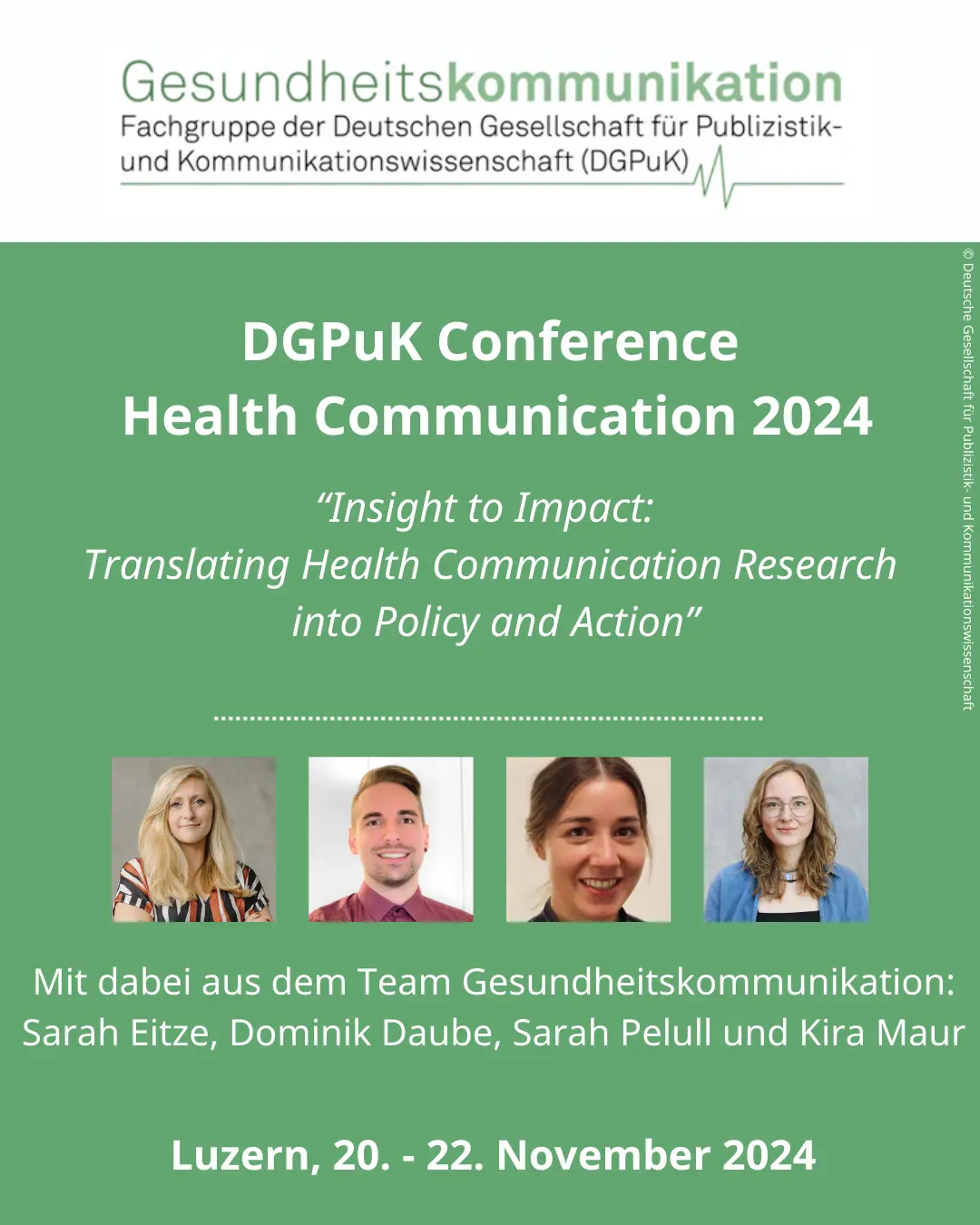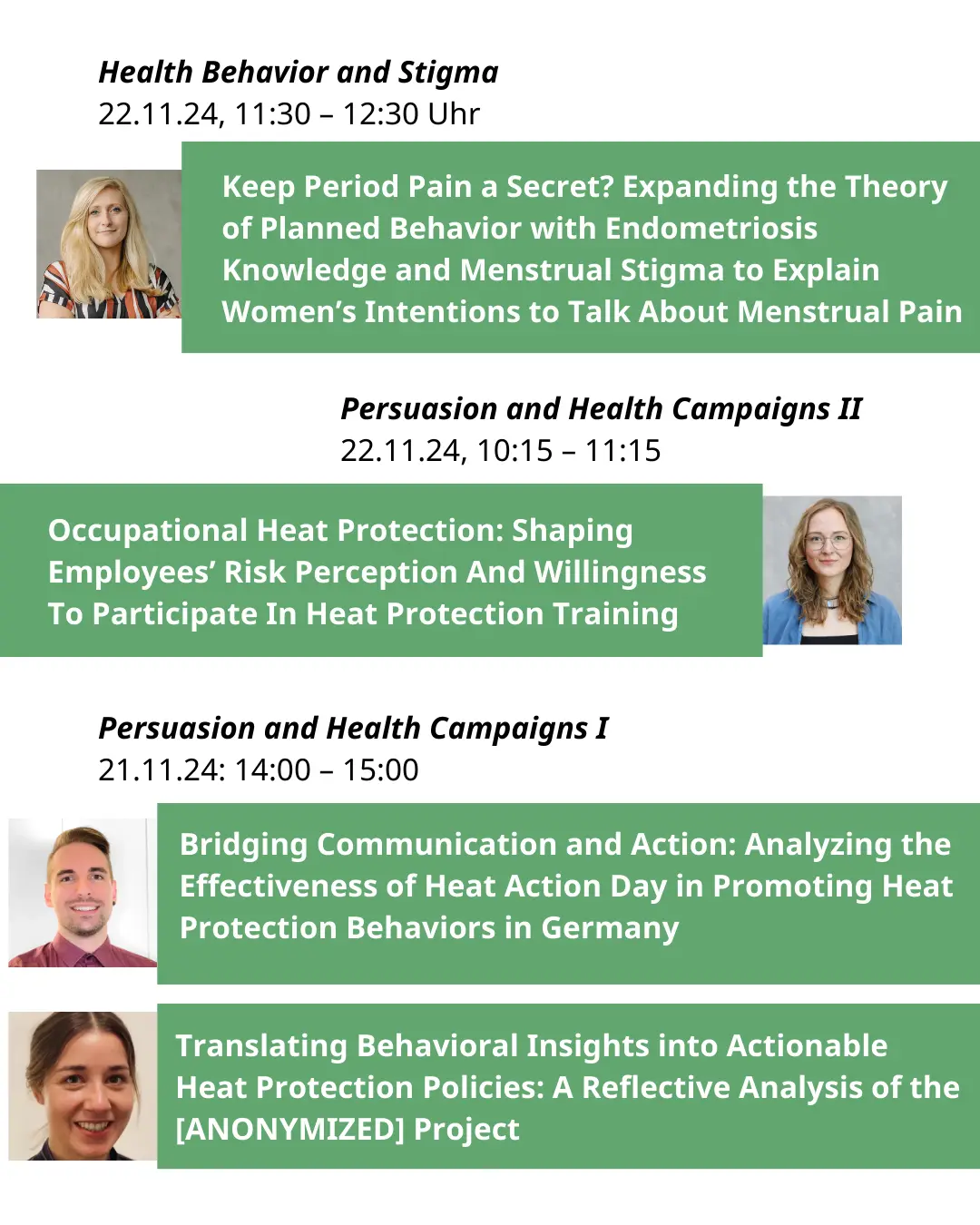 Kira Maur, die in Kürze ihren Abschluss im Master Gesundheitskommunikation macht, wird auf der Konferenz ihre Masterarbeit präsentieren. Sie untersuchte darin, wie Betriebsärzt*innen und soziale Normen die Risikowahrnehmung von Arbeitnehmer*innen und ihre Bereitschaft, an einem Hitzeschutztraining am Arbeitsplatz teilzunehmen, beeinflussen. Ziel ist es, Strategien für effektive Hitzeschutzmaßnahmen am Arbeitsplatz zu entwickeln und politische Entscheidungsträger*innen zu informieren.
