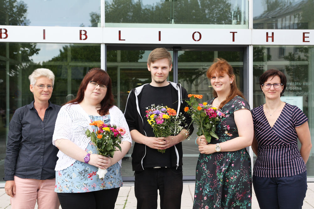 So dürfen sich Maja-Kristin Honigmann (22) und Jaclyn Meisel (21) ab sofort als Fachangestellte für Medien- und Informationsdienste im Bereich Bibliothek bezeichnen und Julien Knospe (23) als Fachinformatiker (Schwerpunkt Systemintegration). Anwesend waren u.a. Bibliotheksdirektor Gabor Kuhles, die Aus- und Fortbildungsbeauftragte der Universität Erfurt Doreen Fröbe sowie die Ausbilder Dr. Valentina Tischer und Andreas Schöppl. Nachdem die Berufsstarter in ihrer dreijährigen Ausbildung nahezu alle Bereiche der jeweiligen Arbeitsfelder kennengelernt haben, werden sie der Universität Erfurt durch ihre Anschlussverträge noch ein Jahr erhalten bleiben und können nun weitere Erfahrungen sammeln.