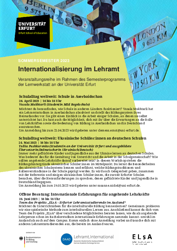 Dabei eröffnen Studierende der Universität Einblicke in unterschiedliche interkulturelle Thematiken wie beispielsweise das aserbaidschanische Schulsystem, Bildungshintergründe ukrainischer Schüler:innen oder Möglichkeiten eines eigenen Auslandsaufenthaltes im Rahmen des Lehramtstudiums. Die Veranstaltungen finden in der Lernwerkstatt auf dem Campus der Universität Erfurt statt. Für einige Veranstaltungen wird um Anmeldung gebeten. Genauere Informationen finden Sie auf dem Veranstaltungsplakat.