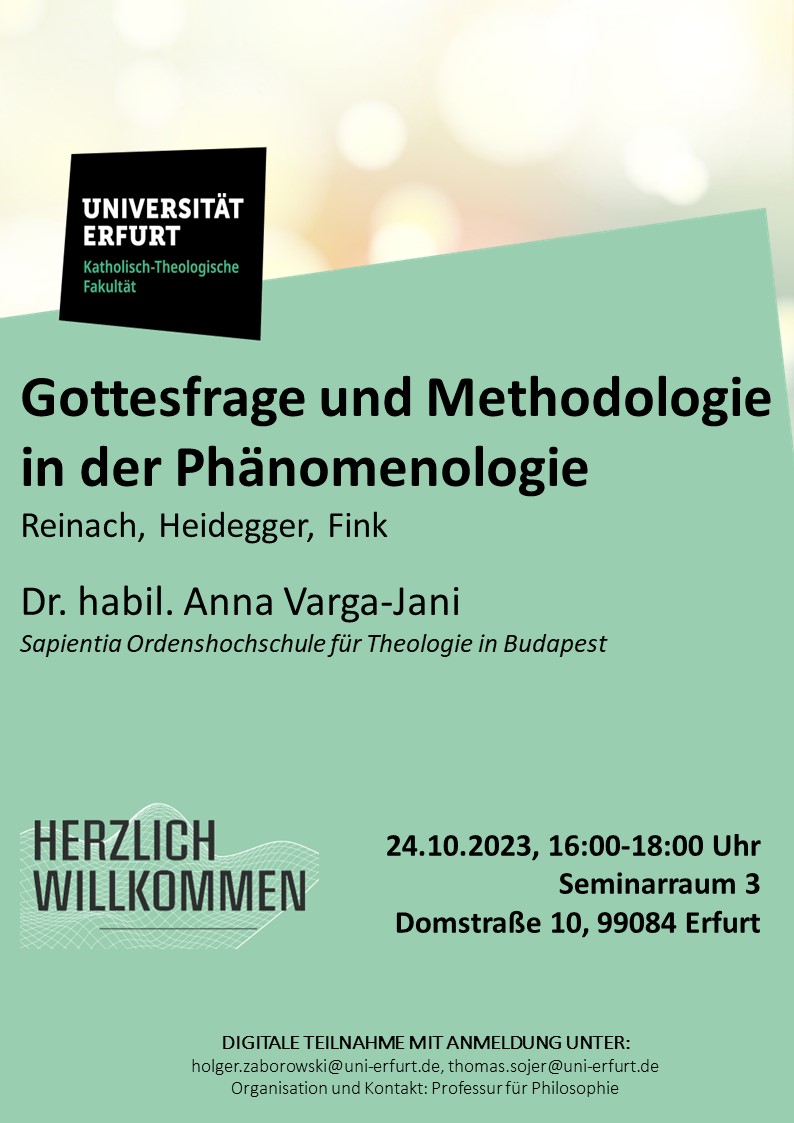 Vortrag: "Gottesfrage und Methodologie in der Phänomenologie – Reinach, Heidegger, Fink" von Dr. habil. Anna Varga-Jani