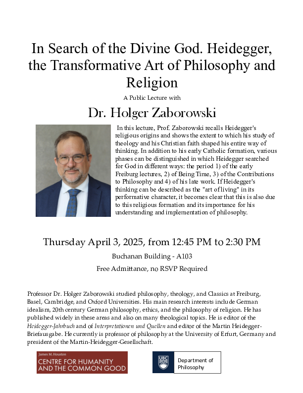 Der Vortrag von Holger Zaborowski findet am Donnerstag, 3. April 2025, von 12:45 Uhr bis 14:30 Uhr, im Buchanan Building - A103 (Vancouver, British Columbia, Kanada) statt. Die Veranstaltung wird organisiert von dem James M. Houston Centre for Humanity and the Common Good und dem Department of Philosophy der University of British Columbia. Der Vortrag ist öffentlich und die Teilnahme frei. Er eruiert den Einfluss christlichen Denkens auf Heideggers Philosophie.