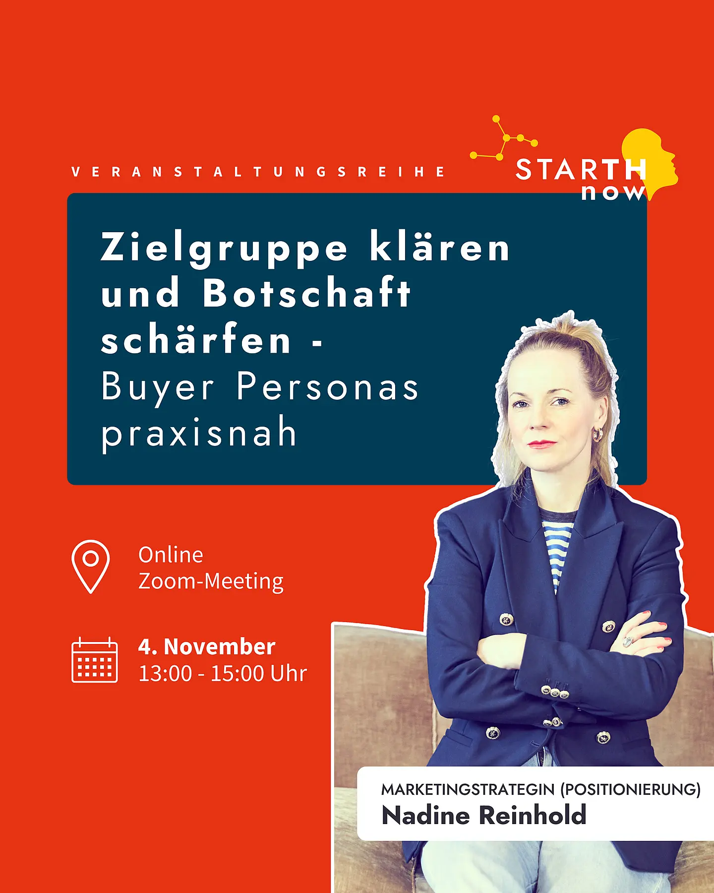 Im Online-Workshop „Zielgruppe klären & Botschaft schärfen – Buyer Personas praxisnah“ entwickeln Sie mit Nadine Reinhold (Marketingstrategin, Positionierung) konkrete Personas als Fundament ihrer Marketingstrategie.