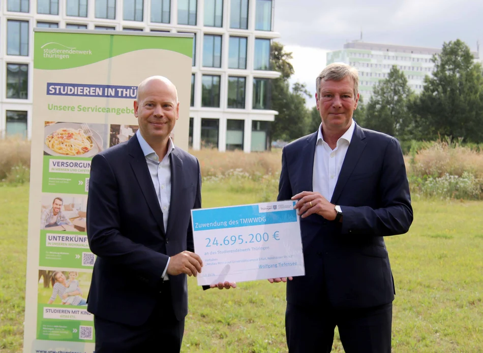 Thüringens Staatssekretär für Wirtschaft, Hochschule, Tourismus und Digitales, Carsten Feller, hat dem Studierendenwerk Thüringen heute Vormittag einen Zuwendungsbescheid in Höhe von rund 24,7 Millionen Euro für den Neubau einer Mensa auf dem Campus der Universität Erfurt überreicht.