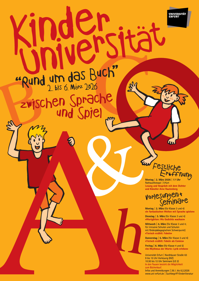 „Gute Geschichten ermöglichen Kindern den Blick in eine Welt, in der sie ihre eigenen Erfahrungen, Wünsche und Hoffnungen wiederfinden und gleichzeitig in Beziehung setzen mit anderen. Eine Begegnung zwischen Kind und Literatur zu ermöglichen und zu befördern, liegt in der Verantwortung von Eltern und Pädagogen. Und dazu leisten wir an der Universität Erfurt seit 2005 einen wichtigen Beitrag“, erklären die Veranstalter*innen vom Fachbereich „Fachdidaktik Deutsch in der Primarstufe“. Dabei unterscheidet sich das Format von anderen Kinderuniversitäten, weil es sich ausschließlich auf literarische Bildung und die Förderung von Lesemotivation von Grundschulkindern und Kindern der Sekundarstufe I konzentriert; es Vorlesungen zu verschiedenen literarischen Genres mit Seminaren kombiniert, die von Studierenden konzipiert und durchgeführt werden, und durch den Besuch ganzer Schulklassen auch jenen Kindern einen Zugang zur Literatur ermöglicht, die derartige Anregungen in der Familie nicht erhalten.