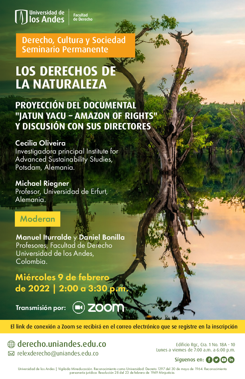 Im Rahmen des Seminars "Derecho, Cultura y Sociedad" der Universidad de los Andes wird der Dokumentarfilm "Jatun Yacu - Amazon of Rights" unter der Regie von Prof. Michael Riegner, Professor an der Universität Erfurt, Deutschland, und Cecilia Oliveira, Senior Researcher am Institute for Advanced Sustainability Studies, Potsdam, Deutschland, gezeigt.