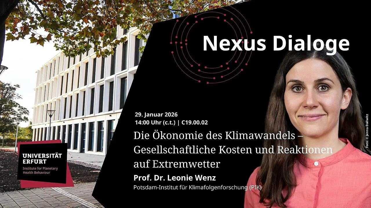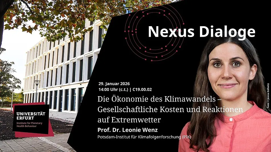 Im kommenden Nexus-Dialog freuen wir uns sehr, Prof. Dr. Leonie Wenz vom Potsdam-Institut für Klimafolgenforschung (PIK) als Sprecherin begrüßen zu dürfen. In ihrem Vortrag wird sie zentrale Erkenntnisse zur Ökonomie des Klimawandels vorstellen: Welche gesellschaftlichen und wirtschaftlichen Kosten entstehen durch klimatische Veränderungen? Wie reagieren Individuen und soziale Systeme auf Wetterextreme und ökologische Belastungen? Und welche Rolle spielen Wahrnehmung, Verhalten und institutionelle Rahmenbedingungen bei der Bewältigung dieser Herausforderungen?