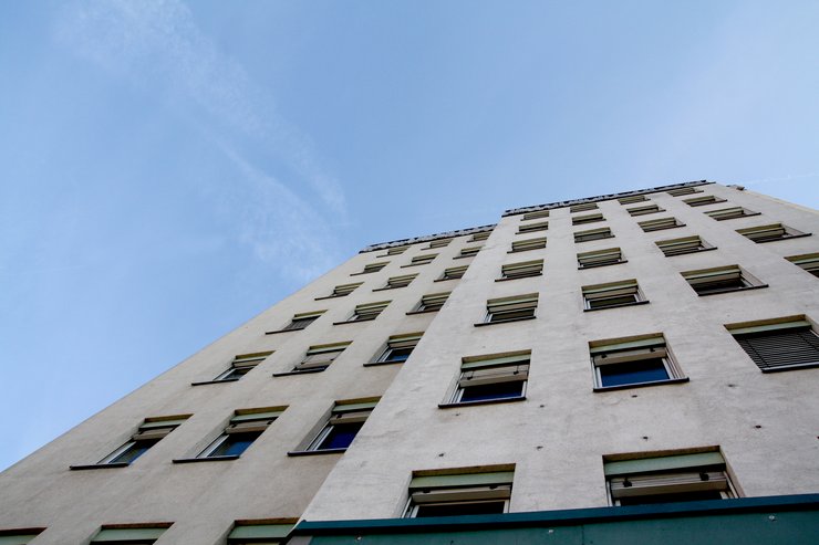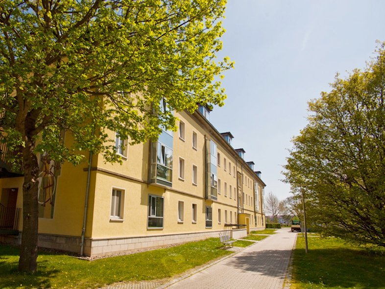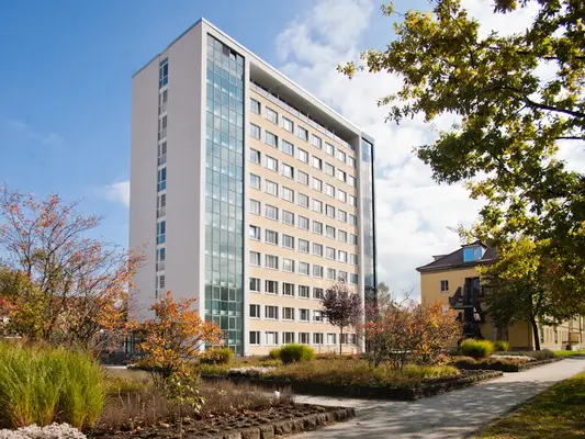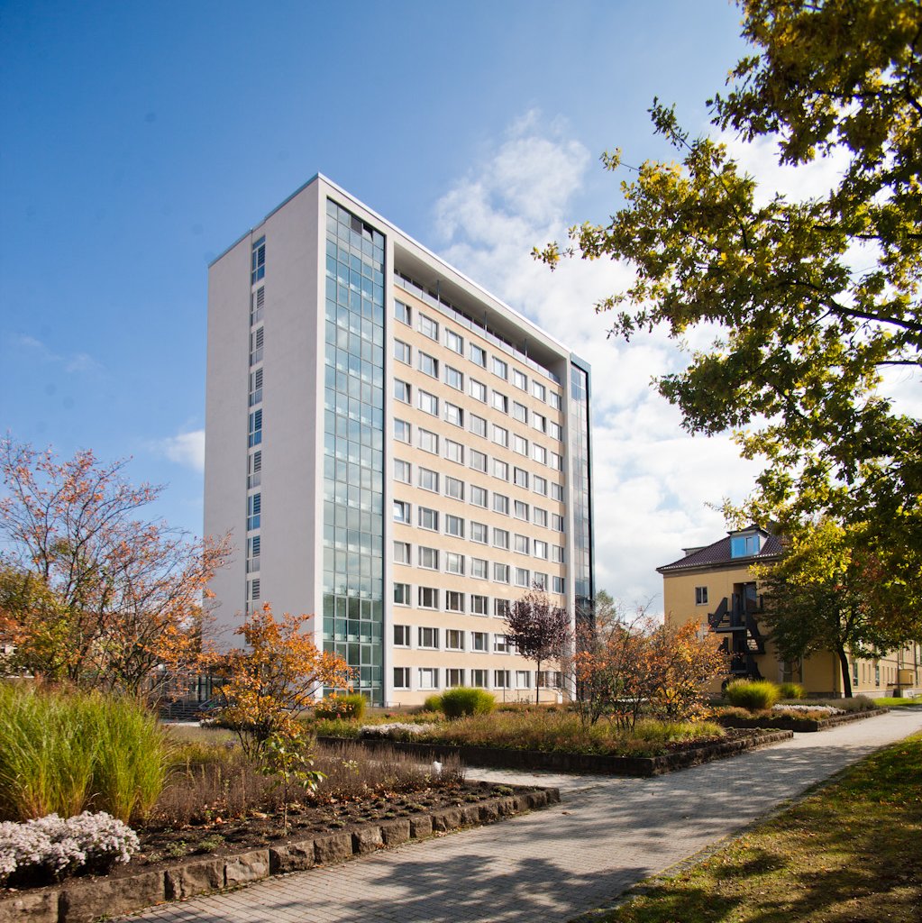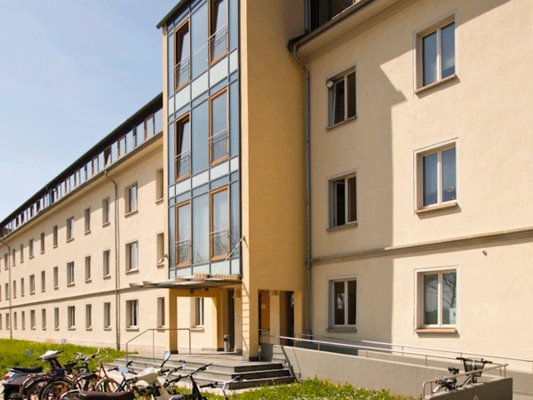 Blickt man vom „Haus der Projekte“ in Richtung Sporthalle befindet sich linkerhand das Wohnheim 4, in dem das Studierendenwerk Thüringen Appartements für Studierende bereithält.