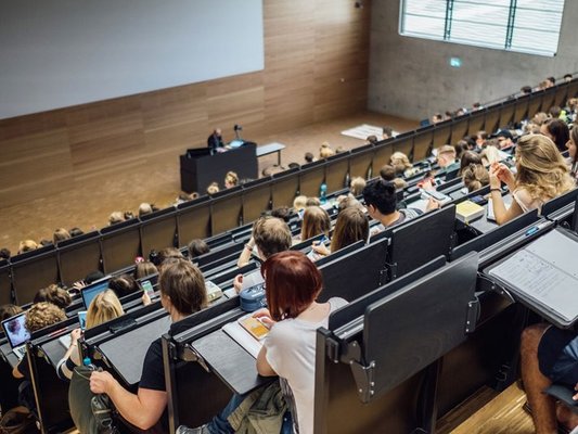 Unser Rundgang beginnt direkt am Haupteingang Nordhäuser Straße. Dort befindet sich das imposante Audimax-Gebäude, das in den 50er-Jahren errichtet wurde. Es beherbergt im Erdgeschoss zwei Seminarräume und die Hochschullernwerkstatt. Im ersten Obergeschoss befindet sich das frühere Auditorium maximum (kurz: Audimax), also der größte Hörsaal der Universität. Er ist aktuell leider geschlossen, weil er umfänglich saniert werden muss. Nach den Bauarbeiten soll der Saal jedoch als Aula bzw. Festsaal wieder zur Verfügung stehen.