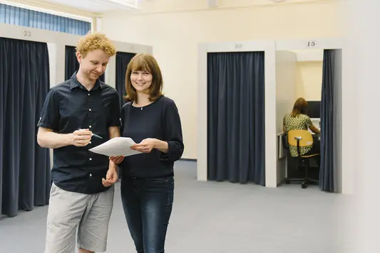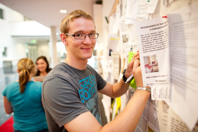 Im Mensa-Gebäude, direkt an der Terrasse, befindet sich der Infopunkt des Studierendenwerks. Er bietet jede Menge Informationen und Services rund ums Studieren. Und hier können auch Slots für die flexible Kinderbetreuung gebucht werden.