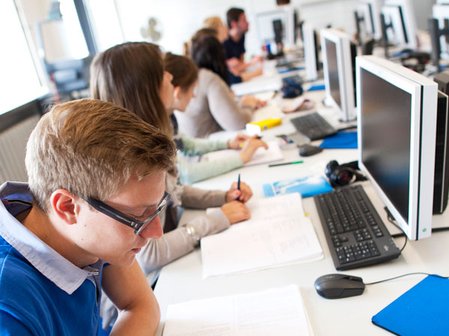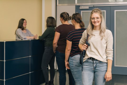 Im Erdgeschoss des Verwaltungsgebäudes befindet sich u.a. das „Front Office“ des Dezernats 1: Studium und Lehre, wo Studierende allerlei Organisatorisches erledigen können.