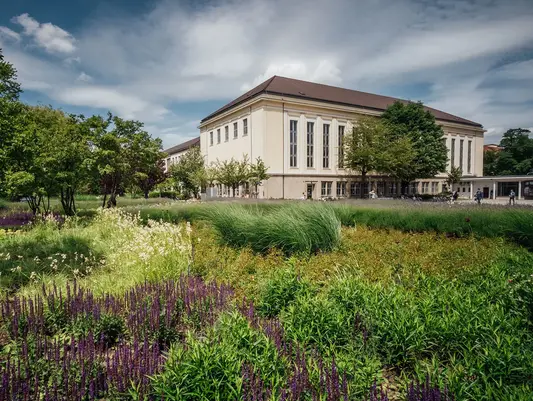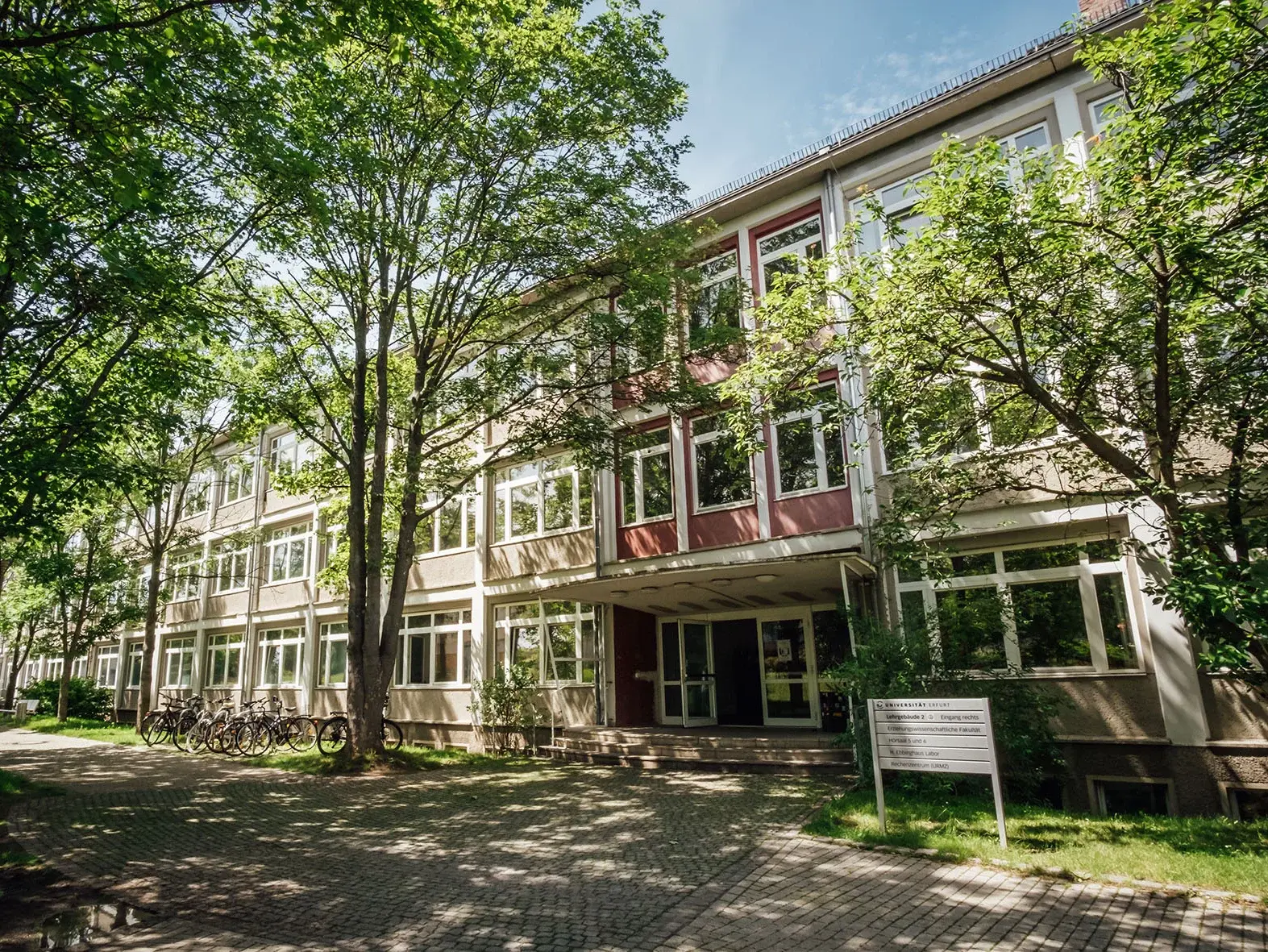 Lehr- und Bürogebäude, Sporthalle, Bibliothek, Schulgarten, Cafés und jede Menge Grünflächen zum Entspannen und Verweilen – das ist der wunderschöne Campus der Universität Erfurt an der Nordhäuser Straße. Die meisten Gebäude hier entstanden in den 50er-Jahren als Standort für die damalige Pädagogische Hochschule Dr. Theodor Neubauer. Heute ist das Ensemble denkmalgeschützt. Auf dem 192.239 m² großen Gelände sind die Wege kurz. Auf dieser Seite laden wir Sie zu einem kleinen Spaziergang ein. Folgen Sie einfach unseren Gebäudecodes von C01 bis C50…