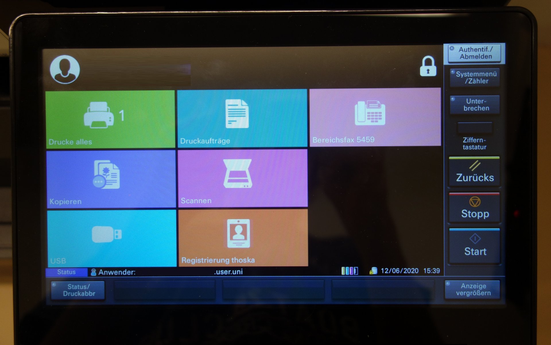 - Nach erfolgreicher Anmeldung öffnet sich das Menü mit den Menüpunkten Drucke alles, Druckaufträge, Bereichsfax, Kopieren, Scannen, USB und Registrierung thoska