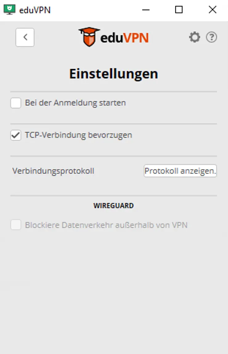 Bei Bedarf kann man im eduVPN-Client die Umstellung auch händisch vornehmen, indem man auf das Zahnrad klickt und dort "TCP-Verbindung bevorzugen" auswählt.