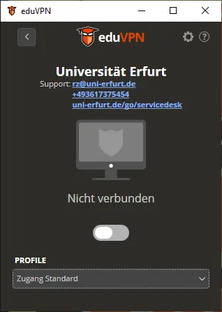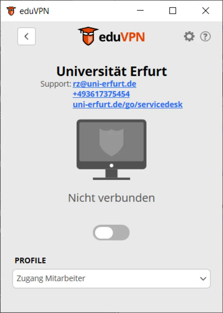 Über den Dienst eduVPN stellt die Universität Erfurt ihren Beschäftigten und Studierenden einen sicheren VPN-Zugang zur Verfügung. Damit können Sie standortunabhängig auf geschützte Ressourcen, wie etwa Bibliotheksdienste, zugreifen. Für die Nutzung ist keine Freischaltung notwendig. Sie benötigen lediglich ein gültiges Uni-Konto.