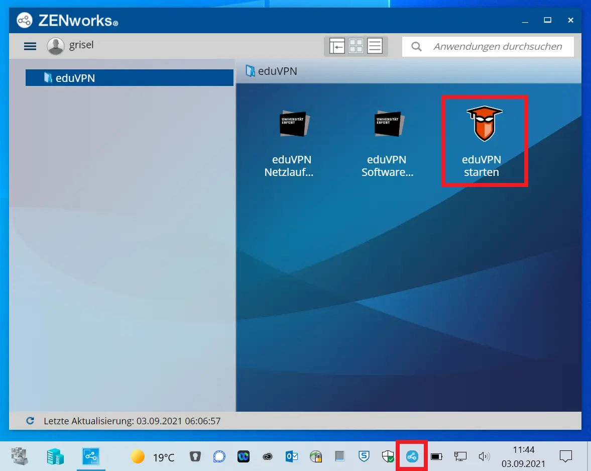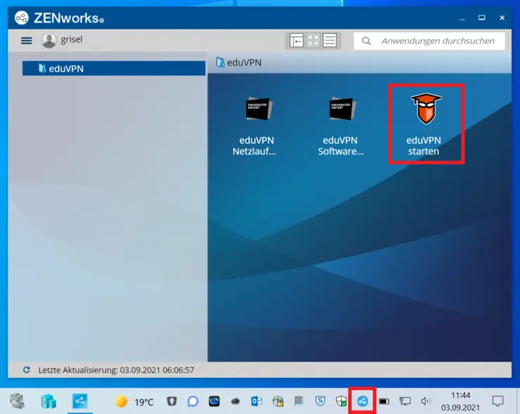 Starten Sie den Client über den Eintrag im Startmenü oder das ZENworks-Icon in der Taskleiste (Doppelklick und anschließend unter "eduVPN" das Icon "eduVPN starten").