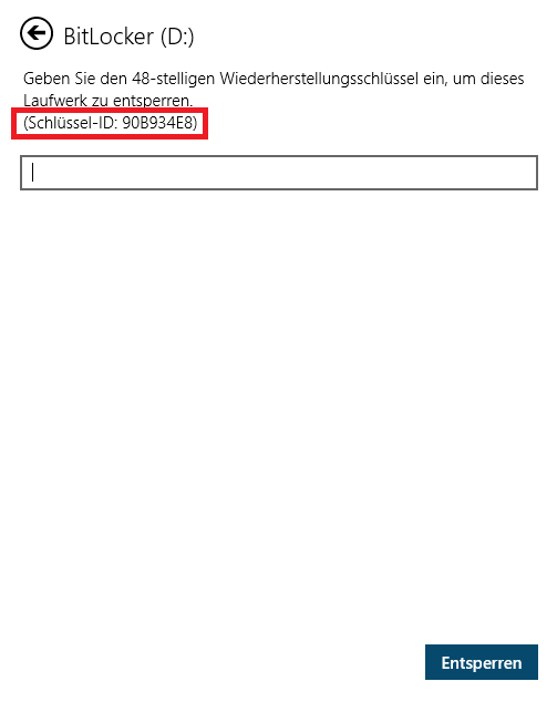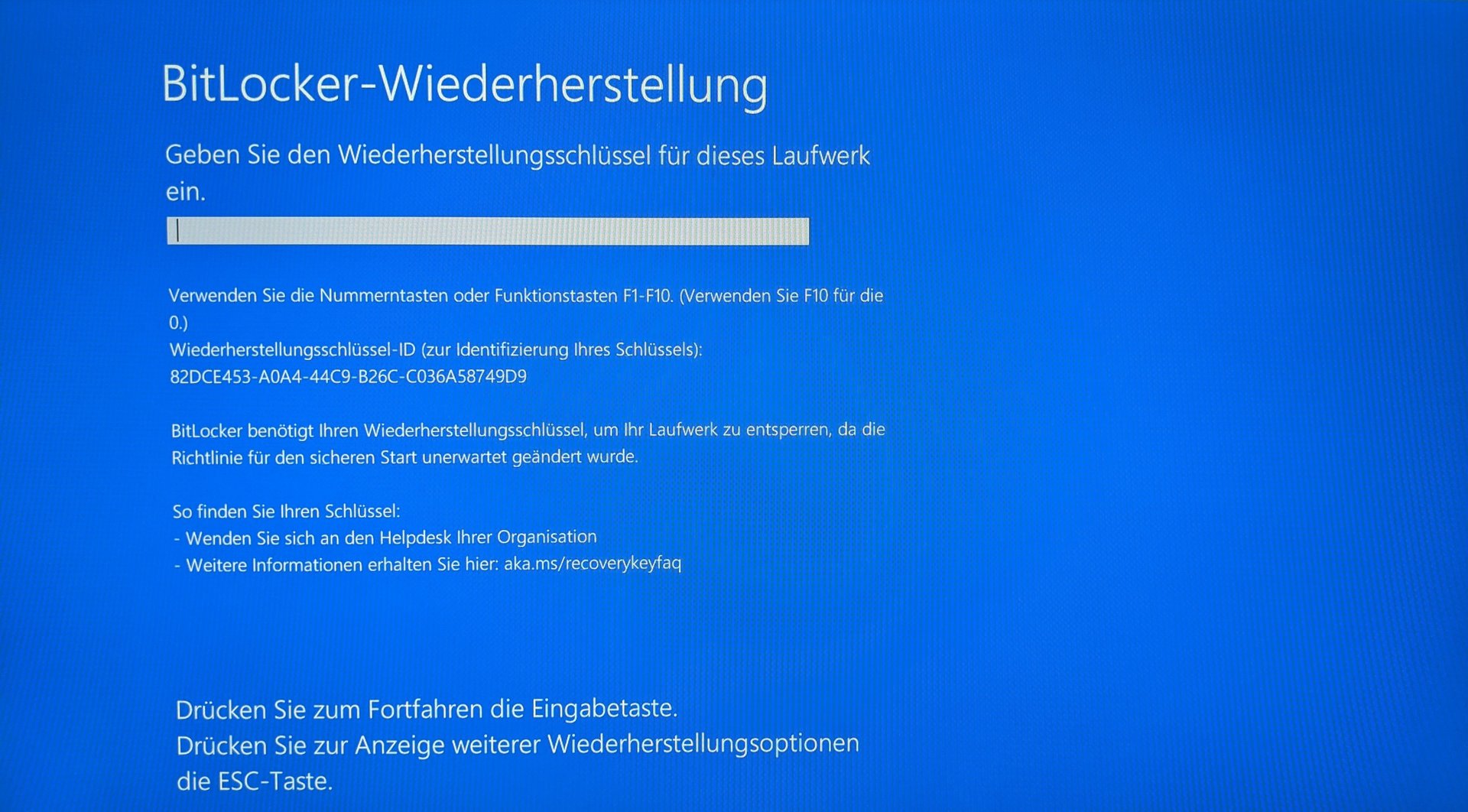 Unter bestimmten Bedingungen (Hardwareänderungen, Updates spezieller Systemkomponenten oder Schadsoftware) kann es im seltenen Ausnahmefall vorkommen, dass Sie aufgefordert werden, einen Wiederherstellungsschlüssel einzugeben. Sie bekommen dann den BitLocker-Wiederherstellungs-Bildschirm angezeigt wie im Bild zu sehen.