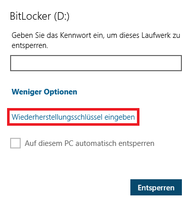 Unter bestimmten Bedingungen (Hardwareänderungen, Updates spezieller Systemkomponenten oder Schadsoftware) kann es im seltenen Ausnahmefall vorkommen, dass Sie aufgefordert werden, einen Wiederherstellungsschlüssel einzugeben. Sie bekommen dann den BitLocker-Wiederherstellungs-Bildschirm angezeigt wie im Bild zu sehen.