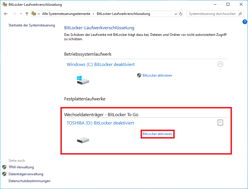 - "BitLocker aktivieren" anklicken (Bild 2)