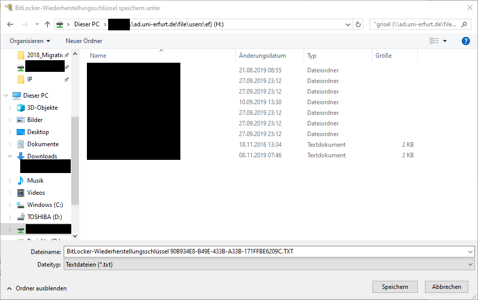 - Im nächsten Schritt ist auszuwählen, wo der Wiederherstellungsschlüssel gespeichert werden soll. Wählen Sie "In Datei speichern" und legen die Datei möglichst an mehreren Orten ab, auf die nur Sie zugreifen können und dies möglichst jederzeit (bspw. in Ihrem Home-Directory (H:) in Verbindung mit eduVPN für den Zugriff von außerhalb). (Bild 4, 5)
