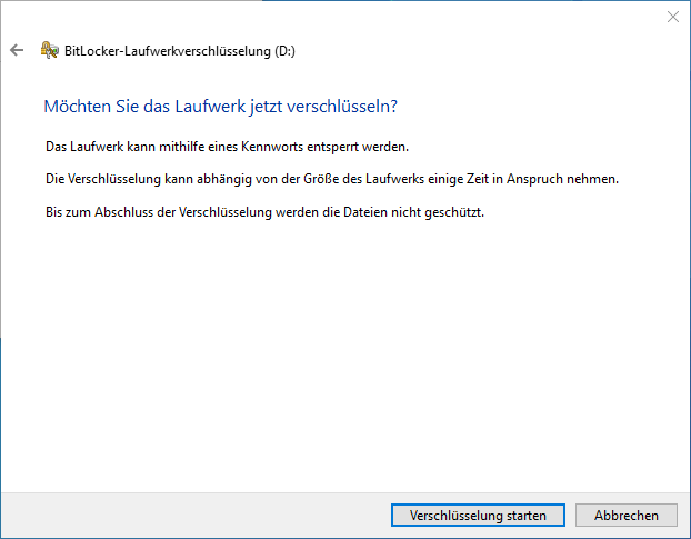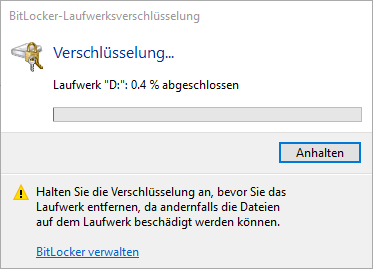 Den USB-Stick oder die Speicherkarte auf keinen Fall während der Verschlüsselung vom Computer trennen. Dies kann zu Datenverlust führen.