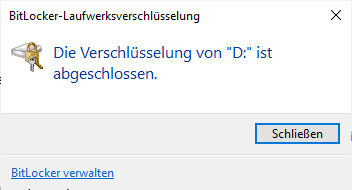 - Das Laufwerk wird verschlüsselt (Bild 7) und abschließend eine Vollzugsmeldung ausgegeben (Bild 8).