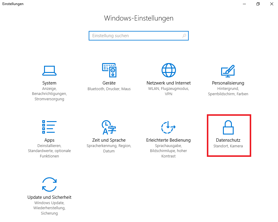 Unter den "Windows-Einstellungen" (Bild 1) befindet sich unter anderem der Bereich "Datenschutz" (Bild 2).