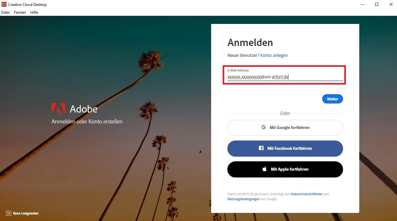 Anschließend können Sie sich in der Adobe Creative Cloud App anmelden und so die Produkte von Adobe nutzen. Die Installation von weiterer Software aus der Creative Cloud oder eine private Nutzung zuhause ist nicht möglich, sondern nur die Nutzung in den Pools der Universität Erfurt.