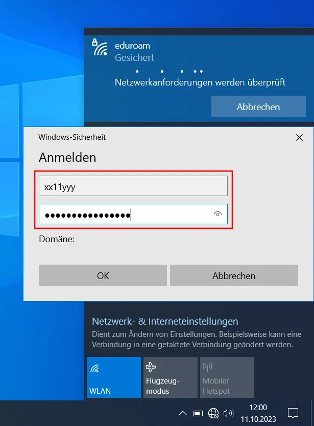 - Schließen Sie alle Fenster. Gehen Sie erneut in den Infobereich der Taskleiste, klicken Sie auf die Erdkugel und verbinden Sie sich mit eduroam. Abschließend werden Sie nach Ihren Zugangsdaten gefragt (Uni-Account) (Bild 9)
