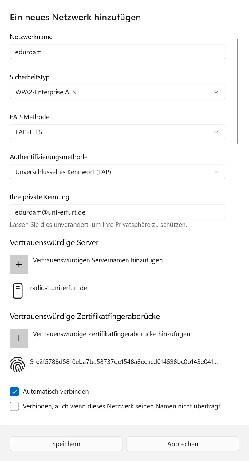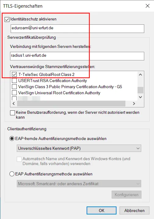 - Vertrauenswürdiger Server: radius1.uni-erfurt.de