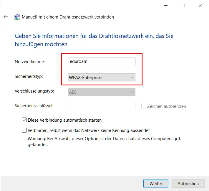 - Als nächstes geben Sie unter Netzwerkname eduroam ein und wählen unter Sicherheitstyp WPA2-Enterprise aus - mit Weiter fortfahren (Bild 5)
