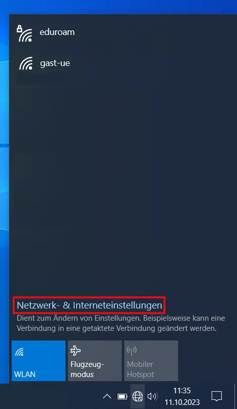 - Klicken Sie im Infobereich der Taskleiste auf die Erdkugel und anschließend auf Netzwerk- & Interneteinstellungen (Bild 1)