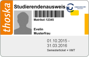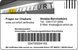Nach erfolgter Immatrikulation erhalten Studierende die Thüringer Hochschul- und Studentenwerkskarte (thoska), zusammen mit dem Stammdatenblatt, per Post zugesandt. Für die Erstellung der Chipkarte muss von Ihnen bei der Online-Einschreibung bzw. nach erfolgter Zulassung ein geeignetes Lichtbild über das Bewerberportal der Universität Erfurt hochgeladen werden.