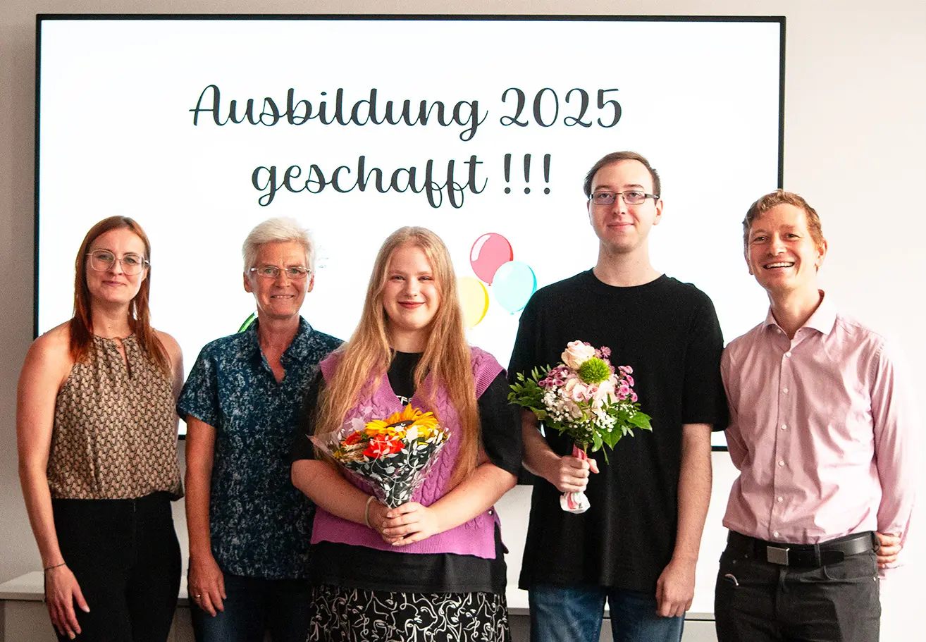Zoe Gohlke und Florian Pegel (in der Mitte) zusammen mit ihren Ausbilder*innen Dr. Valentina Tischer, Eric Schümann und der Ausbilungsverantwortlichen Christin Hoffmann (li.)