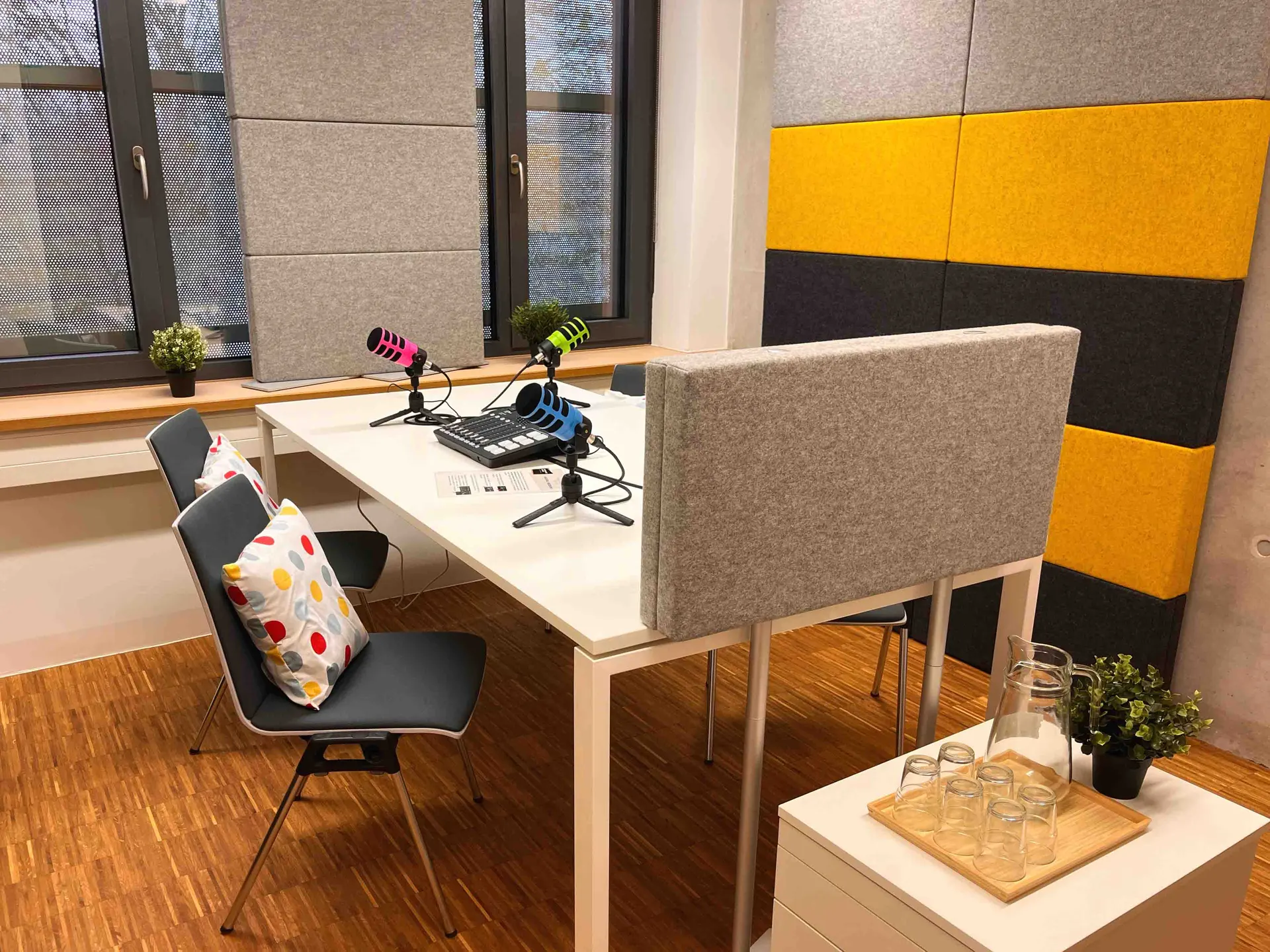 Im Raum 2.12 des KIZ können ganze Podcasts, einzelne Folgen oder andere Audioaufnahmen mit bis zu vier Sprecher*innen aufgenommen werden. Dafür stehen professionelle Mikrofone und ein Mischpult zur Verfügung. Die Aufnahmetechnik ist optimal auf die Raumgegebenheiten abgestimmt und leicht zu bedienen. Die Nutzer*innen benötigen lediglich eine eigene Micro-SD-Karte, um die Aufnahme zu speichern. Um mögliche Störgeräusche zu vermeiden, befindet sich im Produktionsraum kein Computer. Eine Bearbeitung der Aufnahme ist deshalb nur mit einem eigenen Laptop möglich.